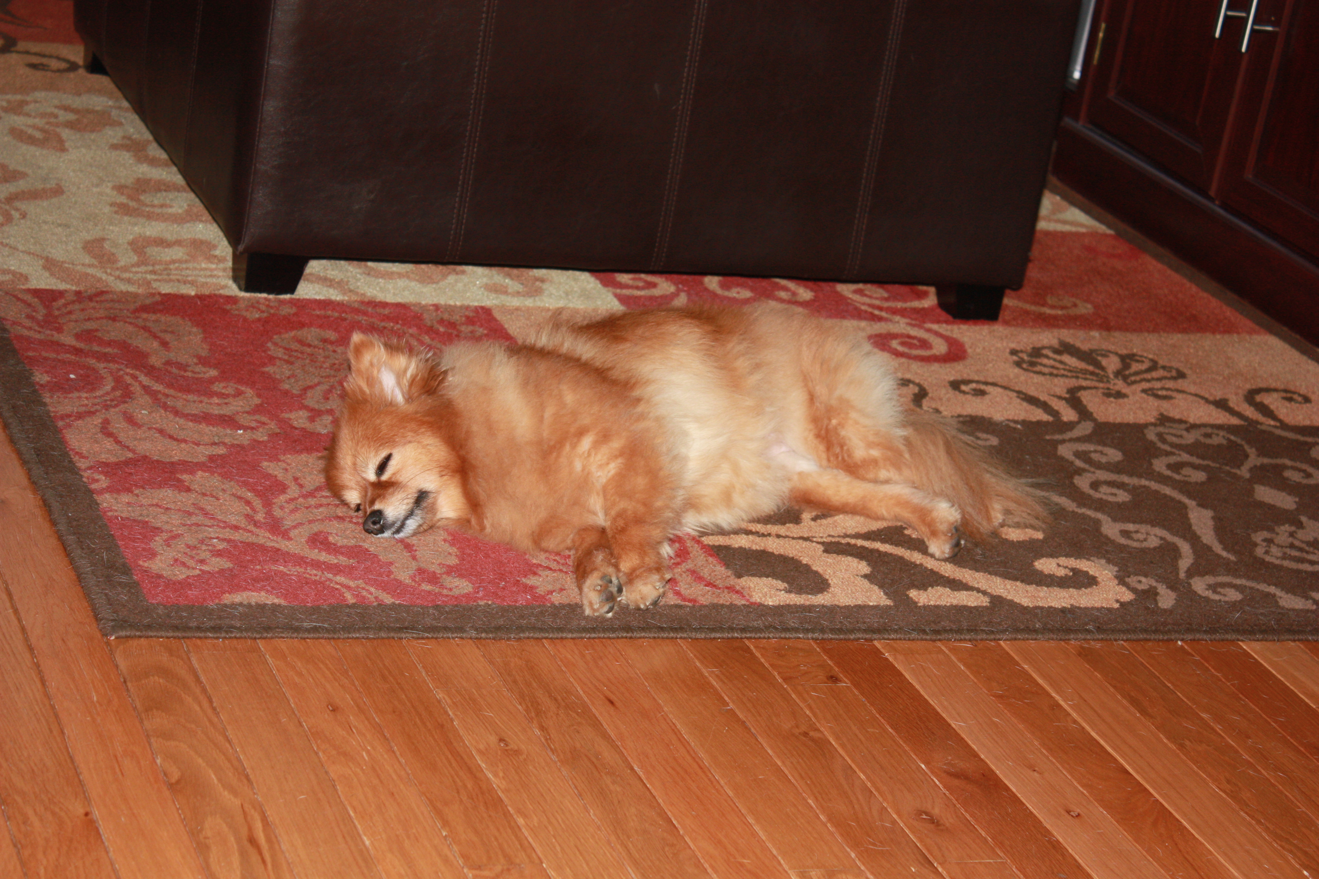 Roxy asleep on one of her favorite spots. Every time I put her bed so she can use it she looks at it and keeps going, but she seems to enjoy my carpet.