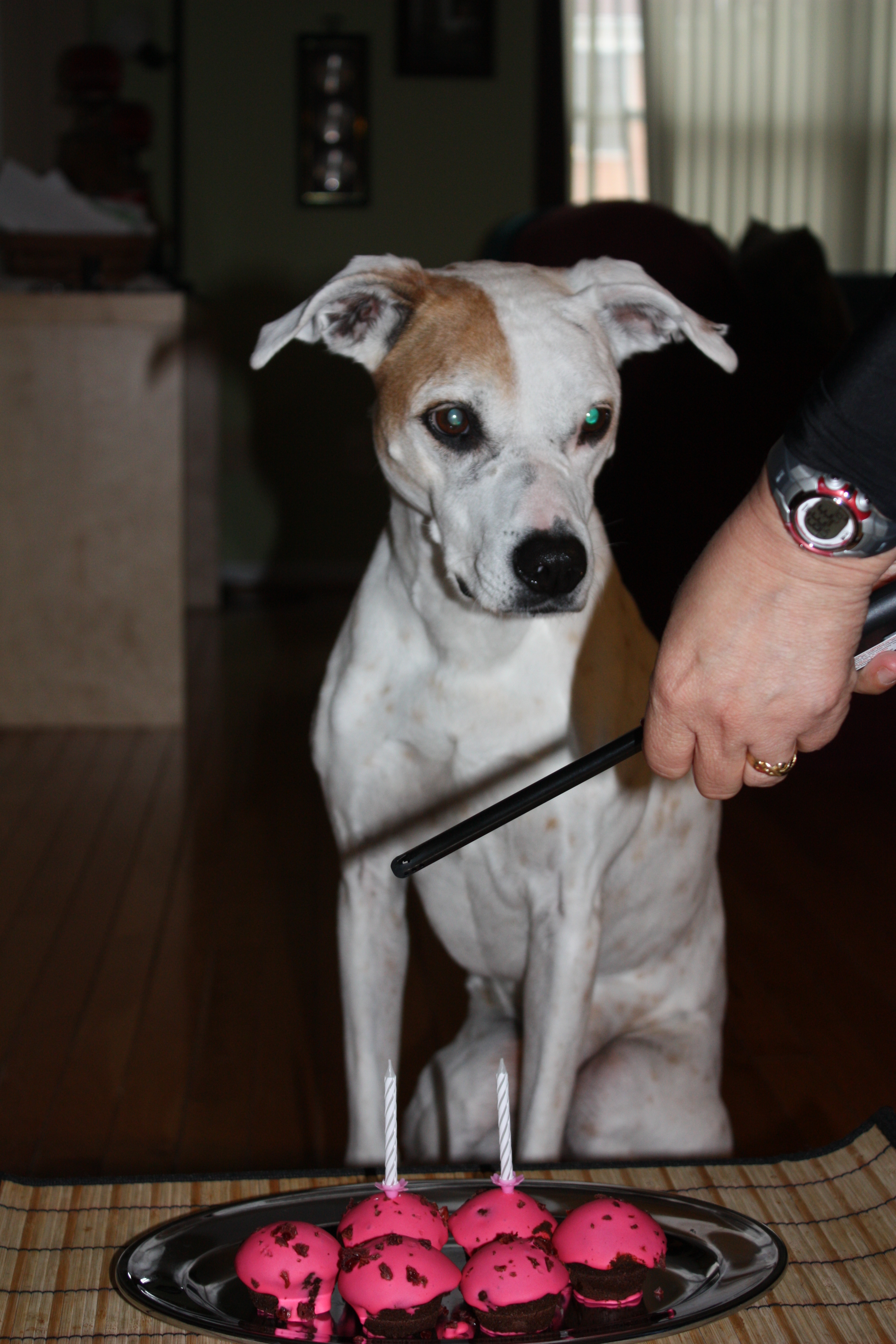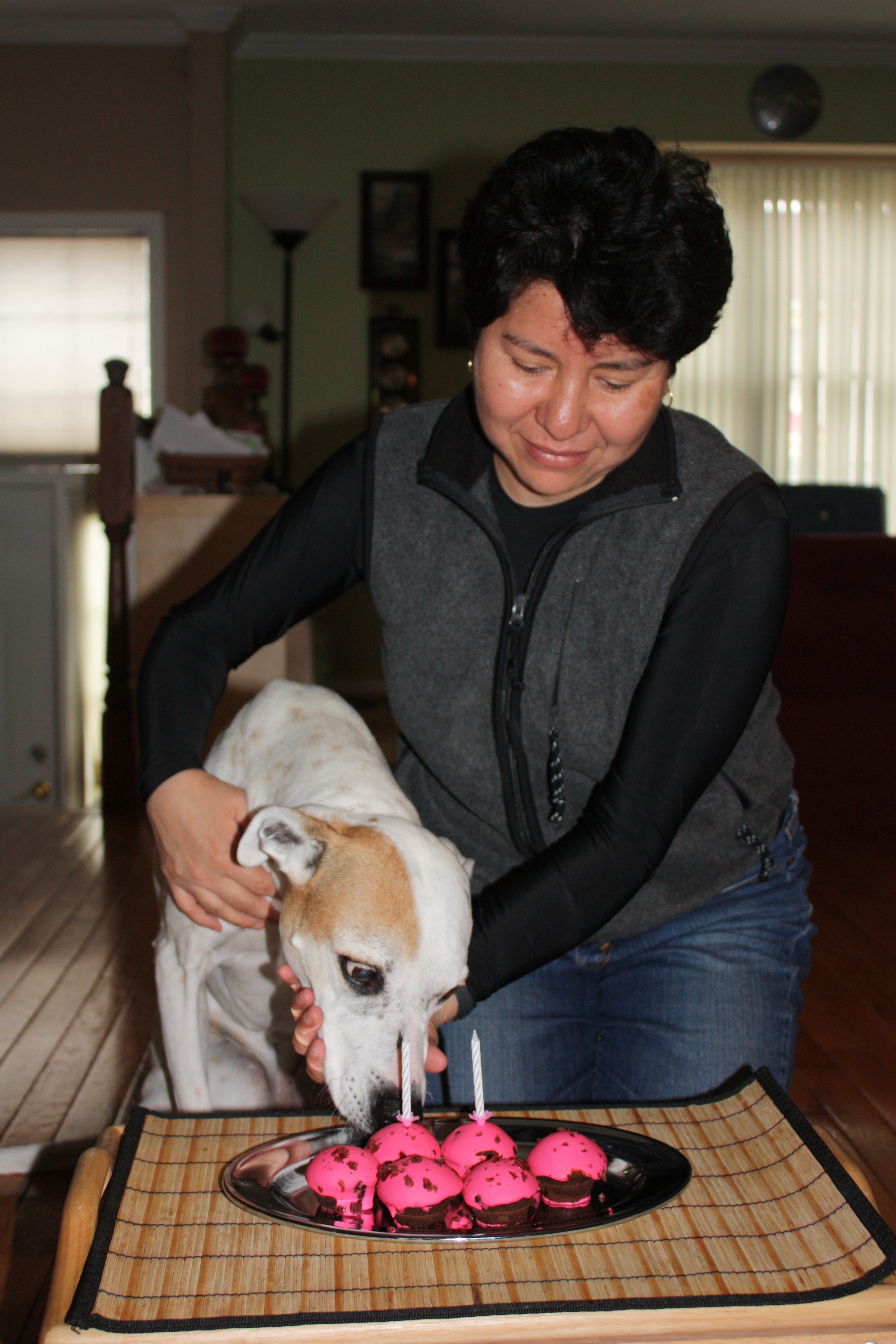 Alex turned 11 on May 5th, but because we had company we had to celebrate it on Monday. In the morning, for breakfast, I made Alex some stir-fry which she inhaled mixed with her kibble. In the afternoon, after she napped, we went to Petco and got some cupcakes, and a Nylabone.