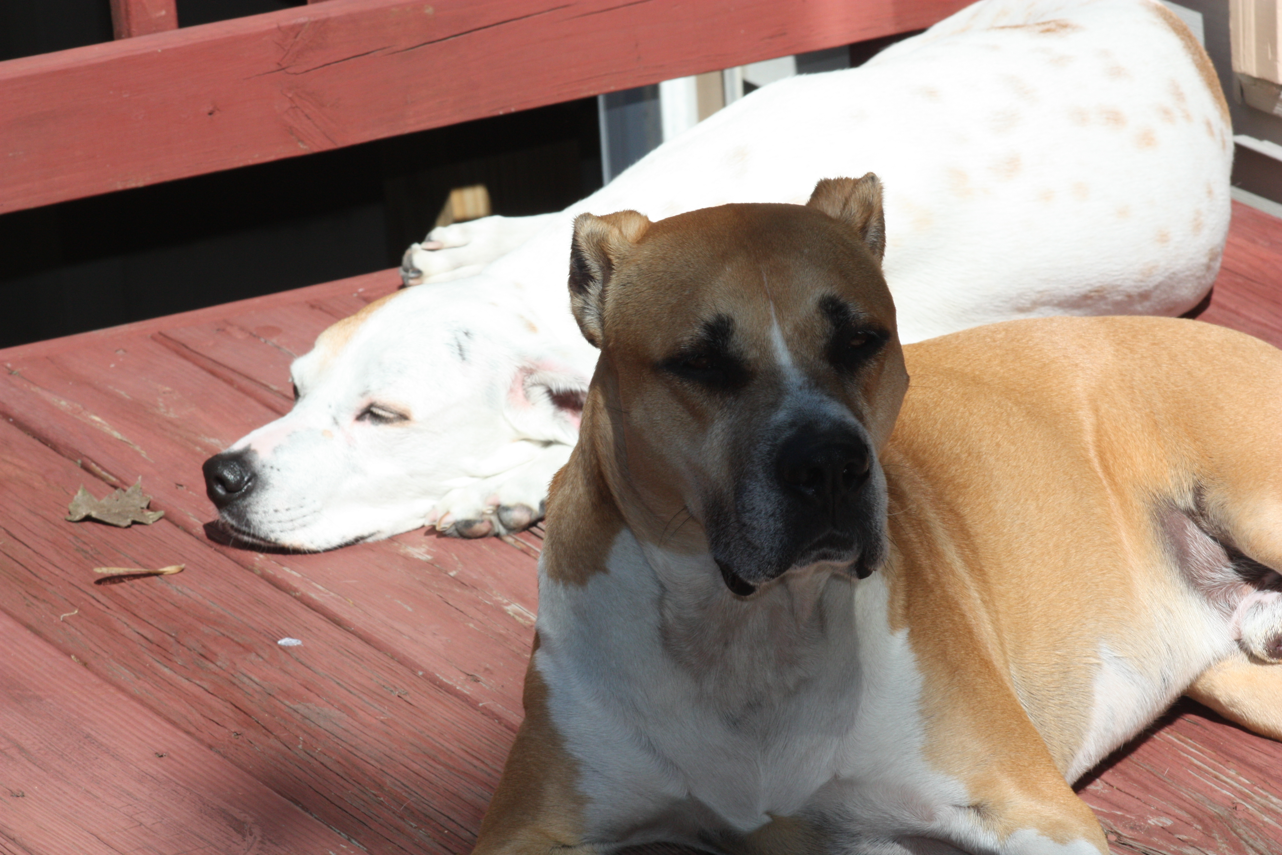 After our morning walk, Alex, a pit bull/Dogo Argentine mix, and Dexter, a boxer mix, were brushed and wiped, and because the weather was so nice we stayed hanging out on the deck for a little while.