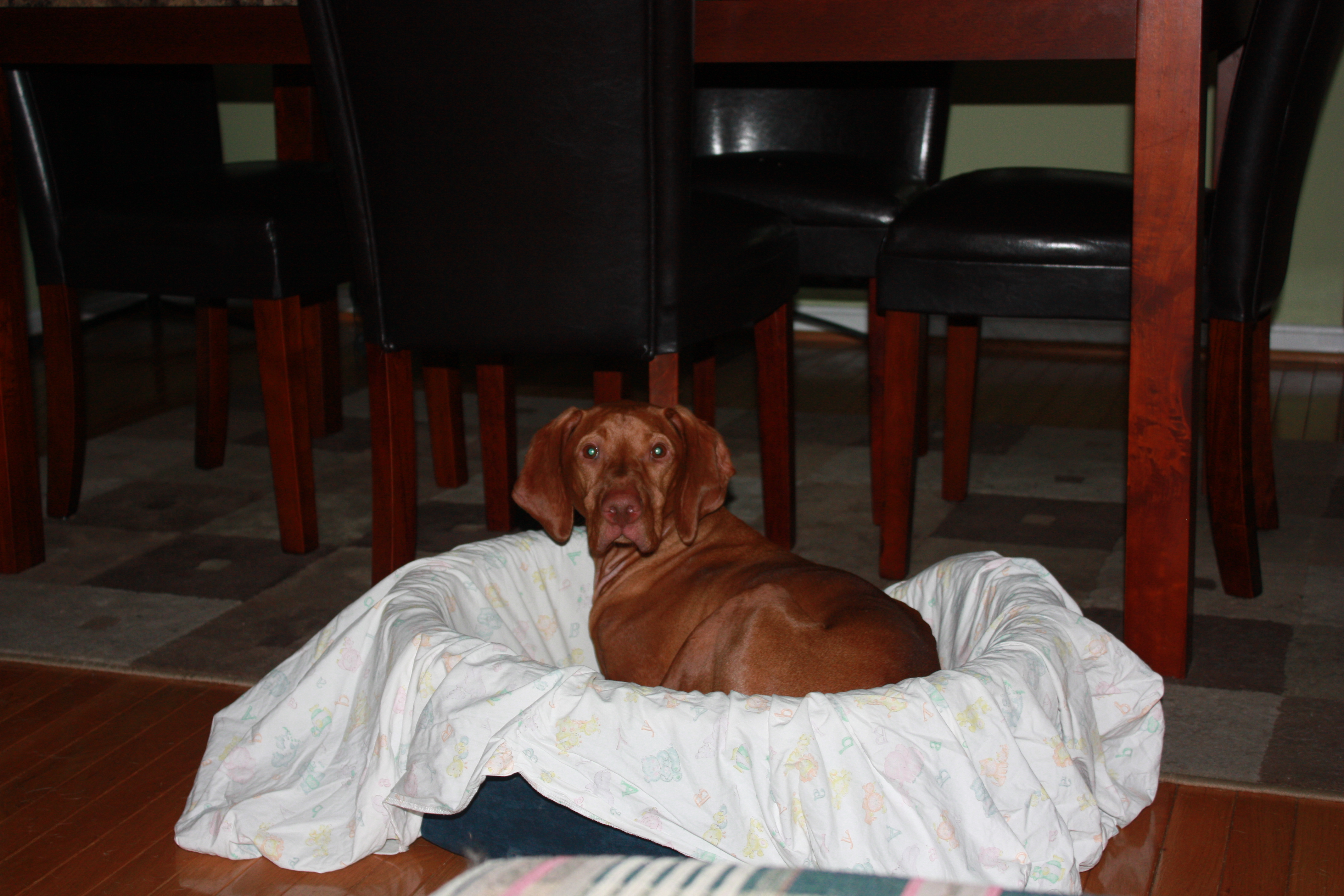 This is Dieter, a 2 1/2 year old Vizsla.  When he is in his bed, he looks smaller than Alex.  He was asleep, but woke up when he saw the flash.  I know, I know, I should have let him sleep, but he is too cute not to photograph.