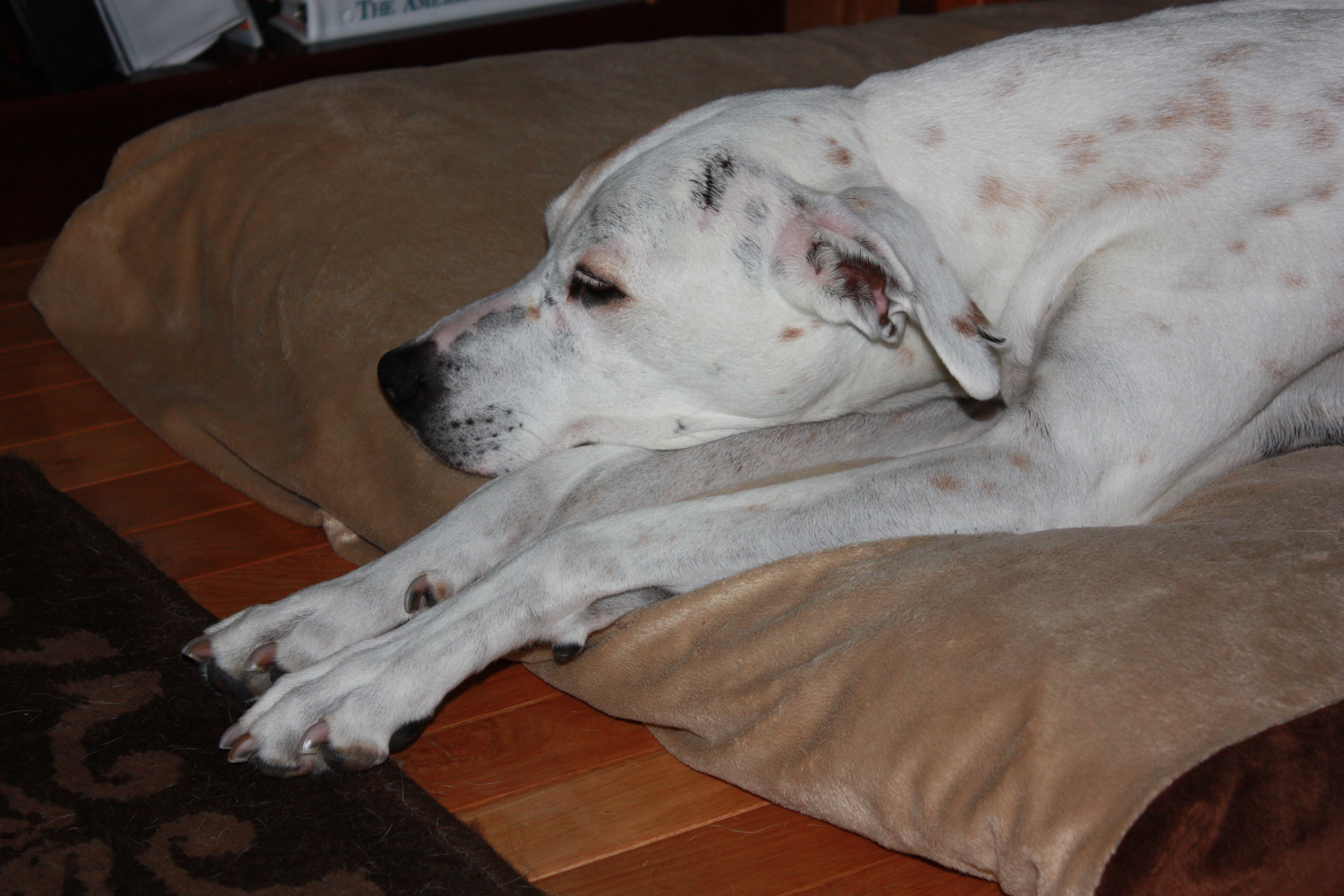 Once we got home, I took her to the back, our deck, brushed and wiped her, and after that she went straight to her bed while I was making breakfast. Cynthia took the above and below pictures a couple of minutes after Alex went to bed.
