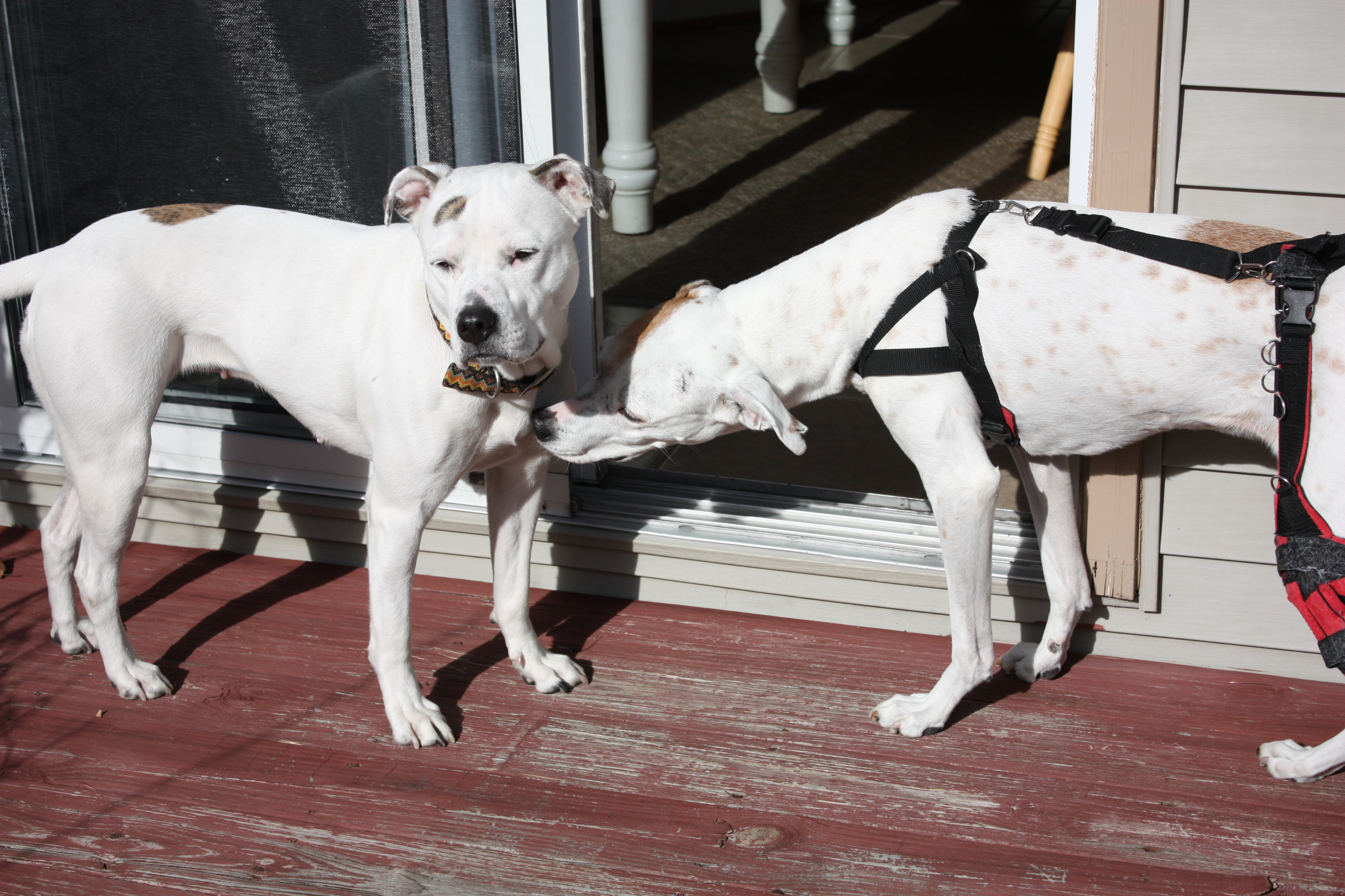 17 days ago, Cynthia and I went to pick up Candie, now renamed Bella, from BARCS, and the progress she’s made so far is amazing. At the beginning, Bella wanted nothing to do with Alex and we did not force her either, but rather took them both for walks, and runs around the neighborhood. Bella’s body language was that of a dog in shock of being outside. More details in another post. Anyway, as time went by, Bella stopped staring and wanting to go for Alex.