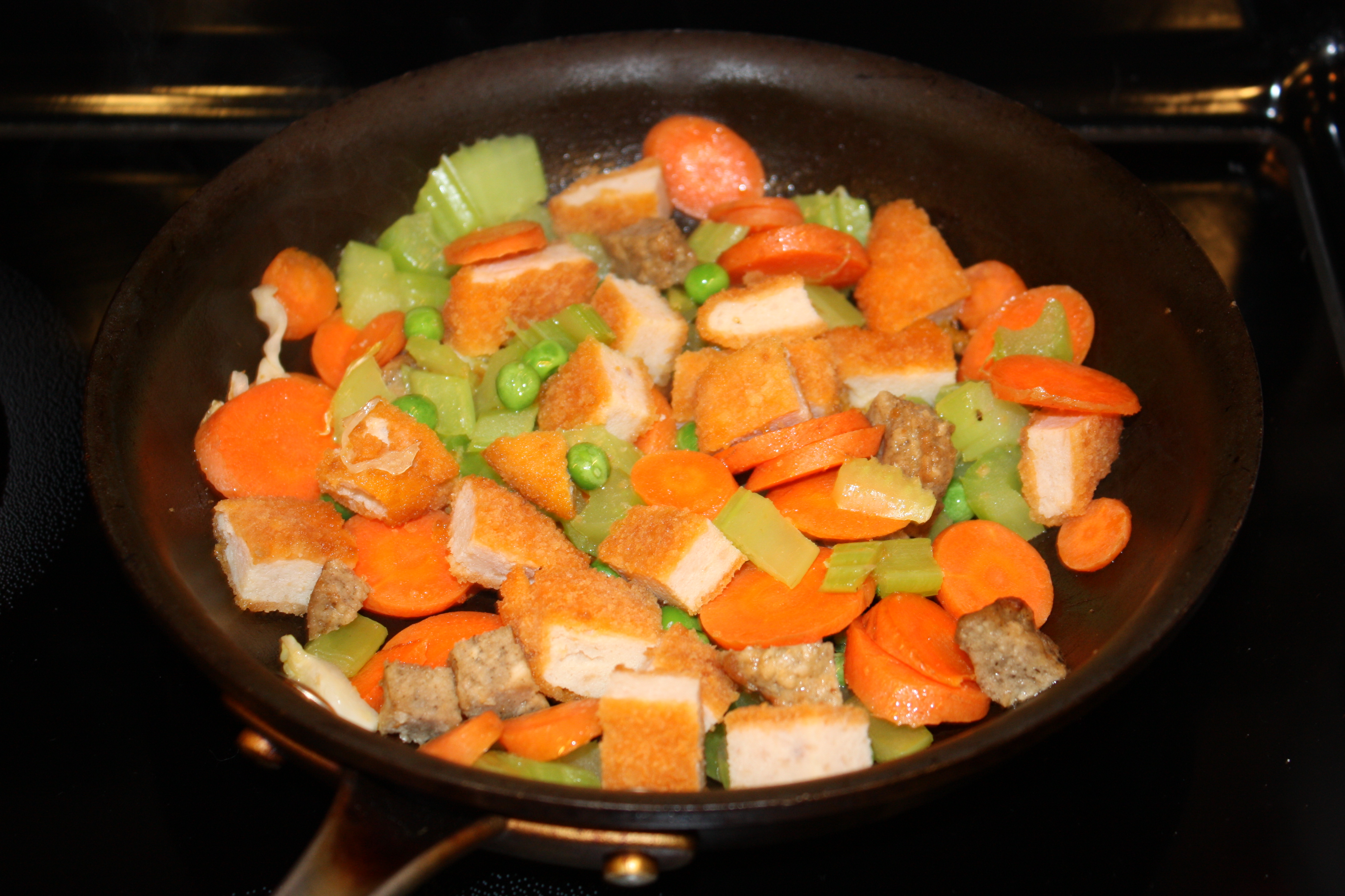 I started by cooking all the veggies together, except for cilantro and ginger, for a couple of minutes. I then added the chicken and sausage patties to it.