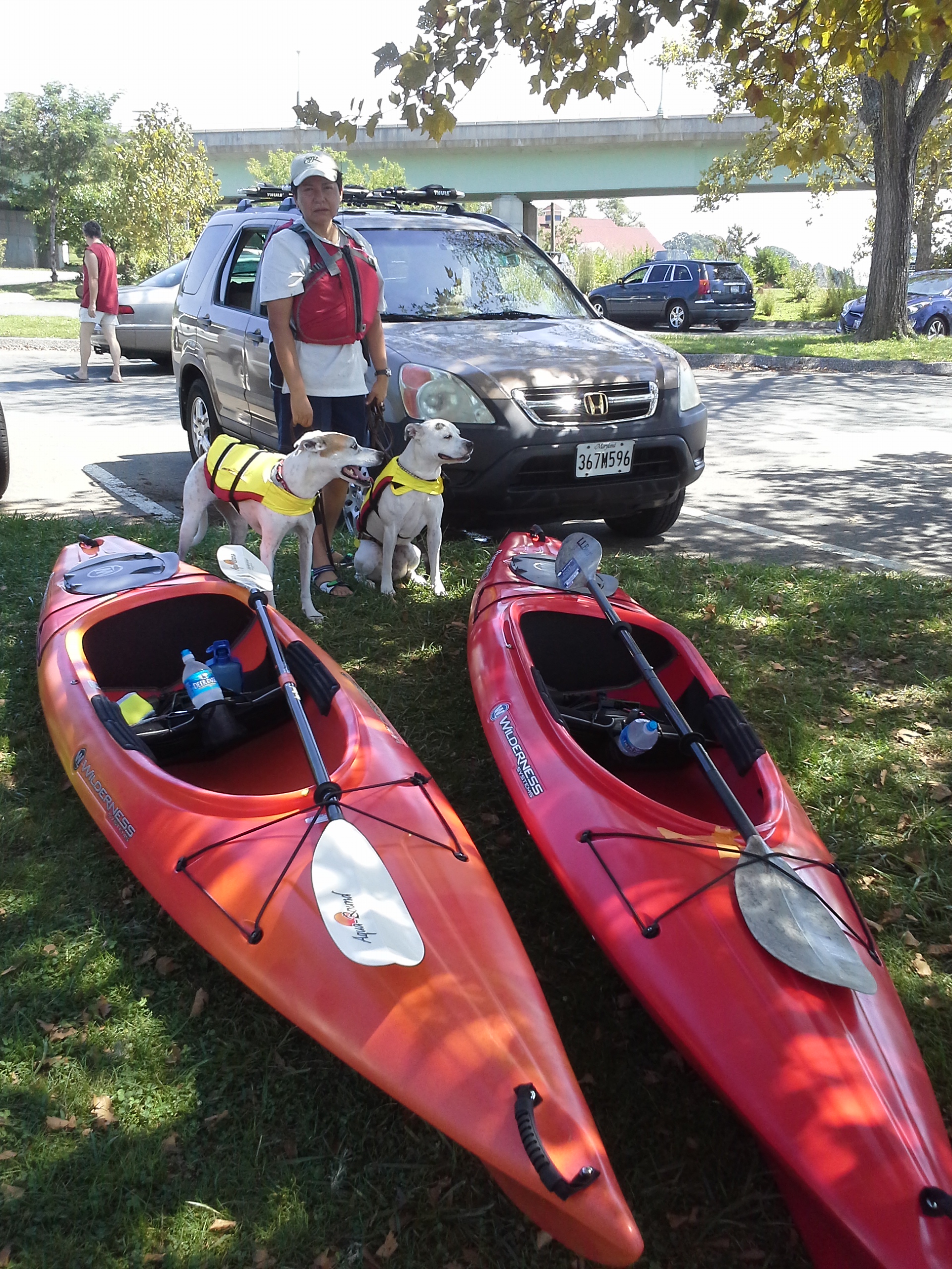 By the way, in order to accommodate Alex and Bella in our kayaks, they weigh 50lbs each, we bought a Wilderness Pungo 120, along with flotation devices for all of us. Please, if you decide to take your dog kayaking, buy a flotation device for her.