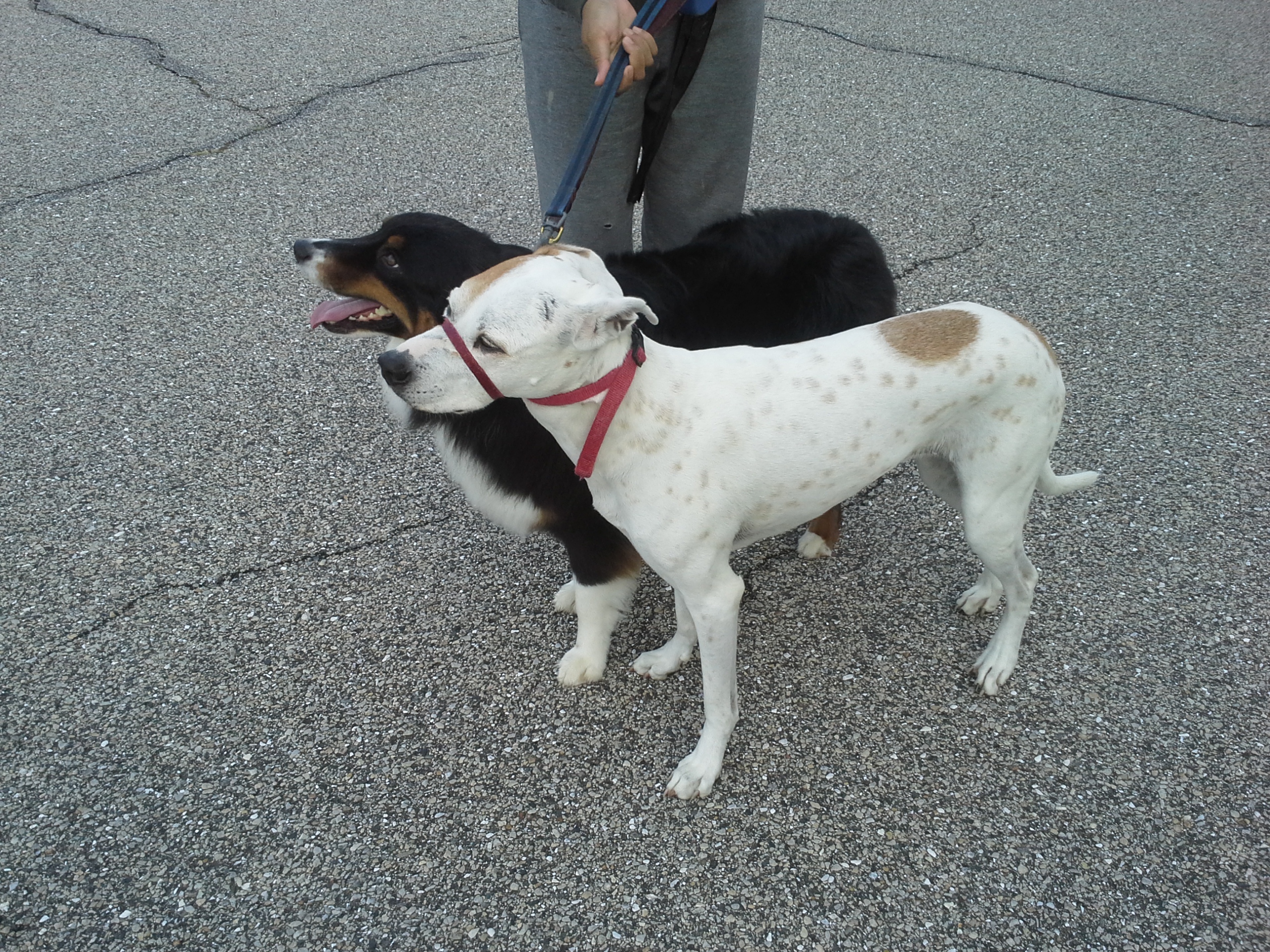 - Dark or black color coats – dogs like Walter, Australian Shepherd in the above picture, tend to overheat faster than dogs with light or white coats like Alex, a Pitbull mix