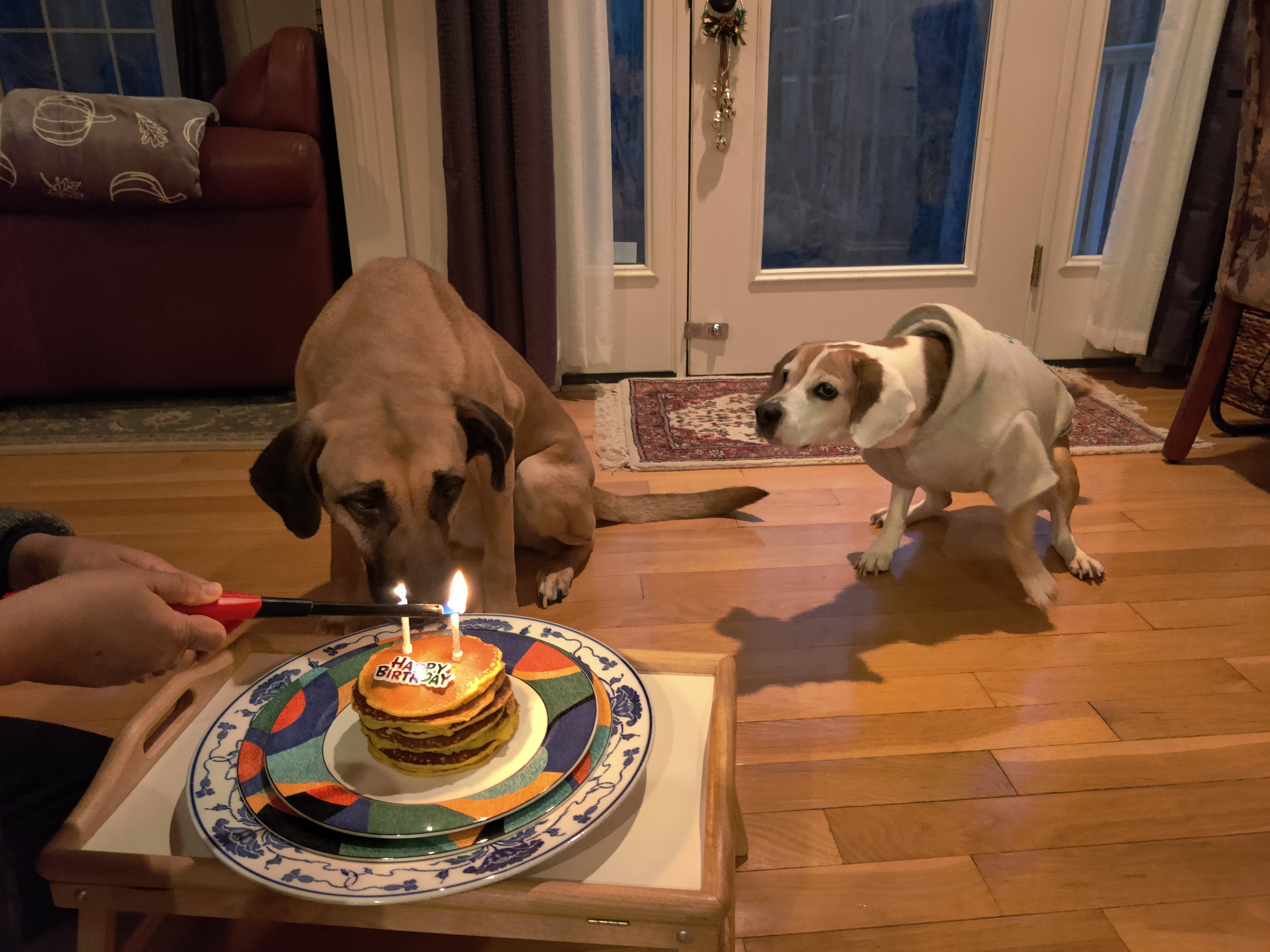 Abby, our cute Beagle/Bulldog mix, just turned 8 years old. Unbelievable! Charlie, the handsome GSD mix, turned 4 years old. By the way, they devoured those pancakes Cynthia made.